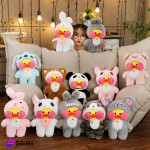 A stuffed toy featuring a cute and cuddly design for adults and children, in the shape of a cheeky duck wearing colorful clothes