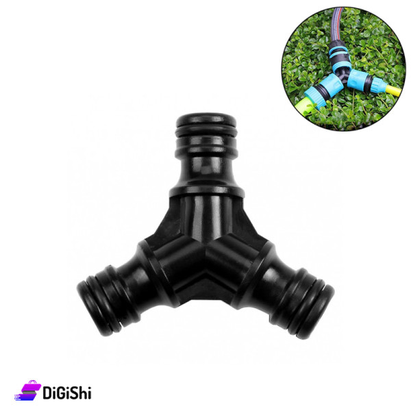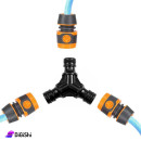 Triple shunt to securely connect water hoses to each other in three directions, used to connect three 0.5 inch hoses to facilitate irrigation or spraying