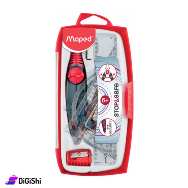 This set includes a compass with an ergonomic design, a non-slip grip, a child-safe blunt tip, as well as a ruler, two triangles, an eraser, a sharpener and a pencil that are made with high-quality materials