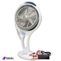 The fan can be operated by electricity when available, and by battery when mains are not available