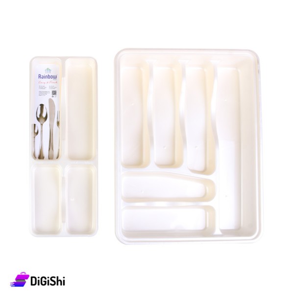 A plastic spoon drawer consisting of two upper and lower sections, the upper part can be placed inside the lower section as it consists of 6 sections to fit spoons, forks and knives, and the upper part is divided into 4 sections to fit different types of cutlery
