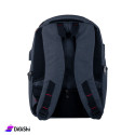 Laptop backpack Made of foam lined fabric Consists of one layer 3 interior pockets And a number of small pockets for pens and cards Front pocket and side pocket It does not contain ports
