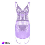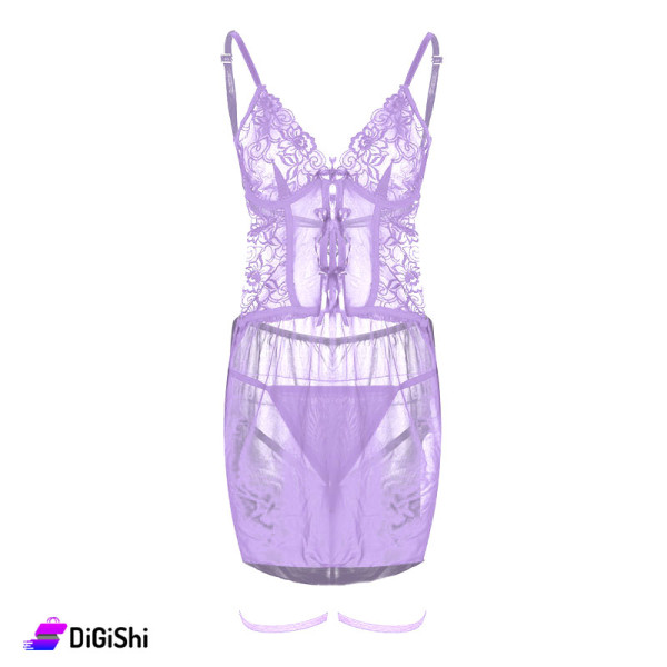 Lingerie with a distinctive and attractive design, it comes in the form of a short open-back dress, made of chiffon fabric, the chest is made of embroidered lace and skewers, it comes with a jacket, and it comes with ties that are placed on the trap