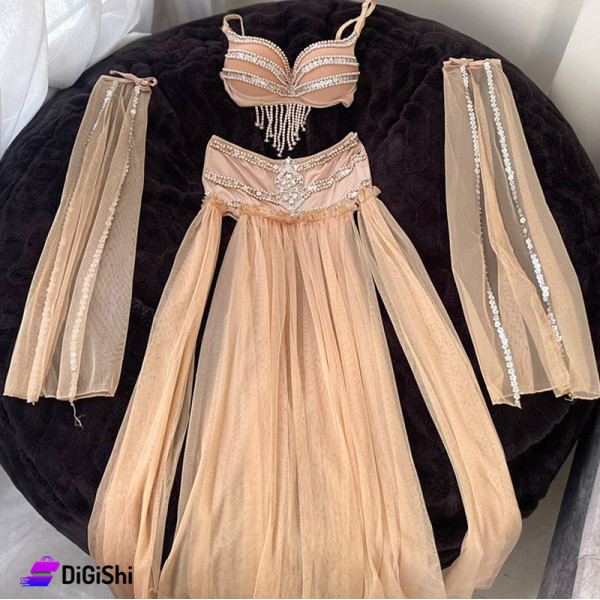 A dance costume that attracts attention thanks to its luxurious design and beautiful color that will ensure highlighting your beauty and femininity. It consists of two pieces, a bra embroidered with pearls, which gives it a charming and wonderful touch, and a long chiffon skirt.