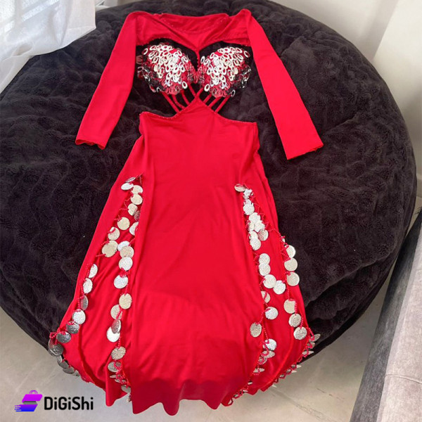A dance suit that attracts attention thanks to its luxurious design and beautiful color that will ensure highlighting your beauty and femininity. Comes in dress form with silver coins, which gives it a charming and wonderful touch