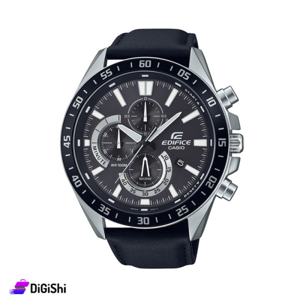 Men's wrist watch made of steel case, durable leather strap with high corrosion resistance, chronograph model with quartz movement, with fluorescent indicators that facilitate reading the time in night light conditions or after the watch has been exposed to sunlight