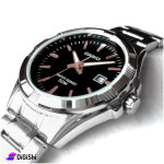 Men's watch, with an elegant, classic and luxurious design, made of a stainless steel bracelet and a three-fold clasp. It also features a black analog display screen made of mineral glass. It is also water resistant to a depth of 50 meters