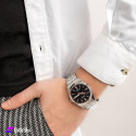 Men's watch, with an elegant, classic and luxurious design, made of a stainless steel bracelet and a three-fold clasp. It also features a black analog display screen made of mineral glass. It is also water resistant to a depth of 50 meters