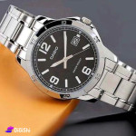 Men's watch, with an elegant, classic and luxurious design, made of a stainless steel bracelet and a three-fold clasp. It features an analog display made of mineral glass, equipped with indicators to display the date
