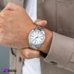 Men's watch, with an elegant, classic and luxurious design, made of a stainless steel bracelet and a three-fold clasp. It features an analog display made of mineral glass