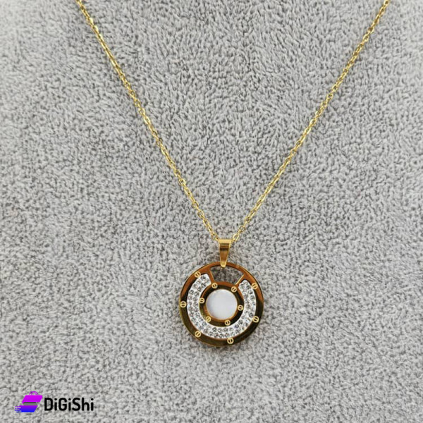 Stainless Steel Necklace with Semicircular Pendant and Strass Gold and White