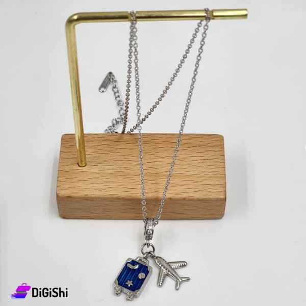 Stainless Steel Necklace with Plane and Suitcase Pendant Silver
