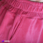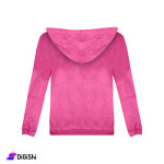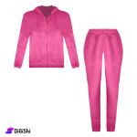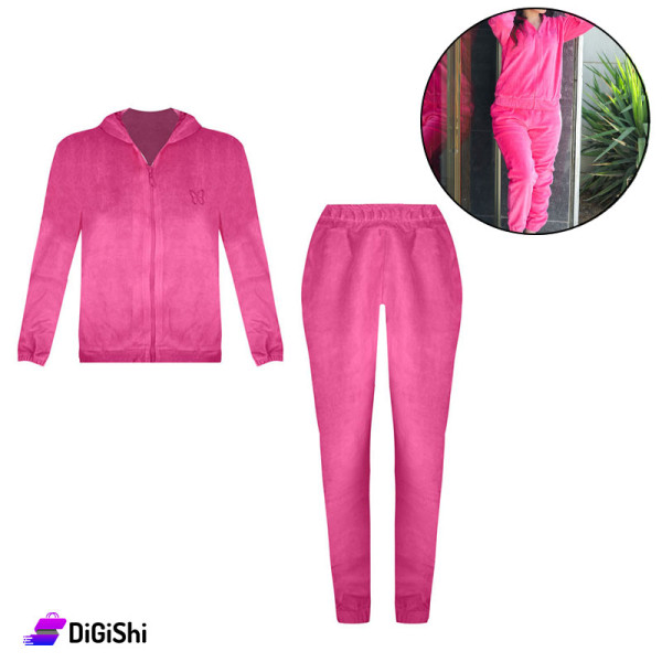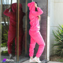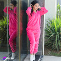 Women's winter pajamas made of high-quality velvet, with a beautiful and elegant design, consisting of a long jacket with a hood, two front pockets and a butterfly drawing, in addition to velvet pants with pockets and rubber ankles