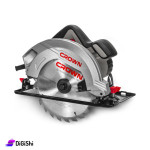 The saw features a circular blade mounted on a pivoting arm, allowing it to be angled and rotated to cut materials such as wood, metal and plastic
