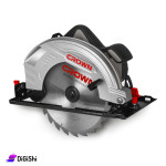 The saw features a circular blade mounted on a pivoting arm, allowing it to be angled and rotated to cut materials such as wood, metal and plastic