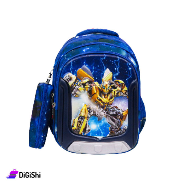 A school backpack suitable for primary school students, with an elegant and practical design and a suitable size, it includes an embossed robot graphic on the front layer, made of Made of water repellent upholstered fabric, protects the items inside, so it is the most appropriate choice in Winter season, easy to clean with belts that can be easily controlled in length