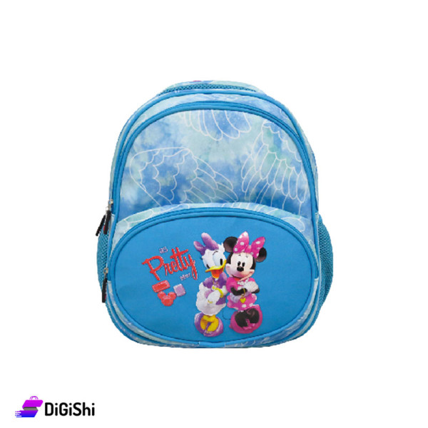School backpack, made of quilted fabric, featuring an elegant and distinctive design, satin printed, In addition to minnie mouse and duck drawing on the front pocket