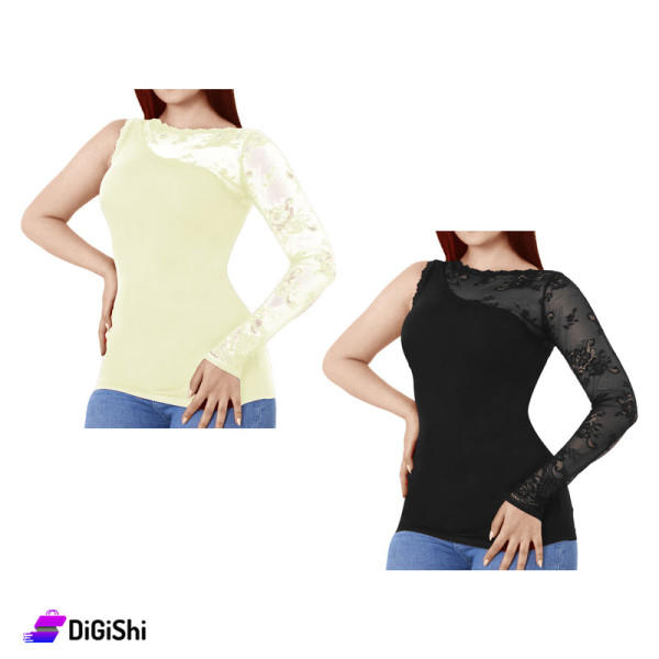 A women's sweater, characterized by an elegant and beautiful design. It comes with one sleeve made of beautiful lace, and a lace chest as well, which gives it a touch of beauty, It is also comfortable, practical, and has a soft texture