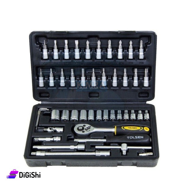 Pieces: Slide bar, flexible tape, adapter piece, screwdriver handle, ratchet handle, 21pcs socket bits, 13pcs metric sockets, universal joint, 2pcs extension bar, 4pcs hex wrenches