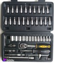 Includes 1/4" drive ratchet wrench and screwdriver handle included with a variety of ports and bits