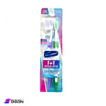 A box containing two high-quality toothbrushes consisting of two types of bristles for teeth whitening, characterized by Medium, regular, and three-dimensional bristles.